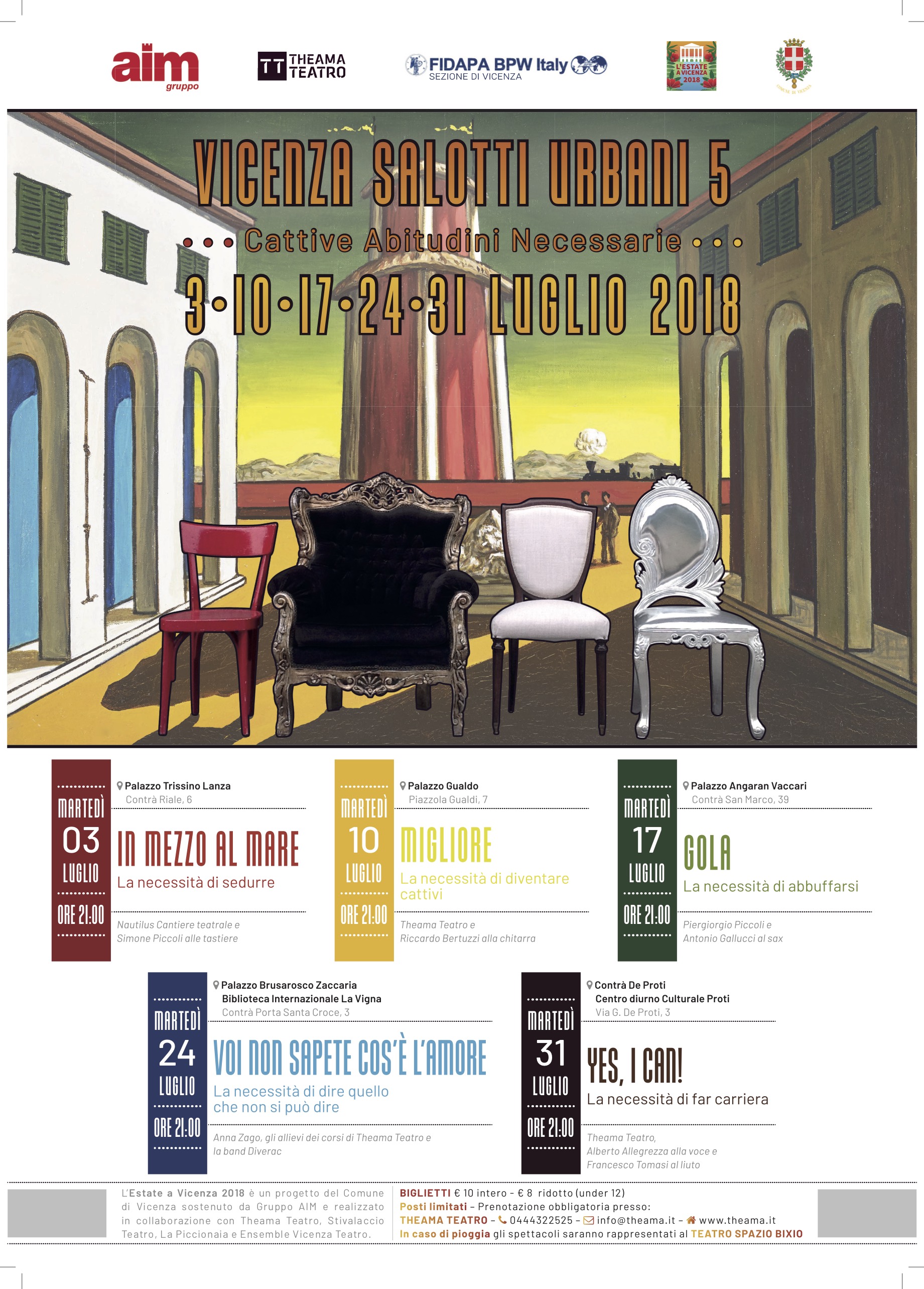 Lo spettacolo è il quinto e ultimo appuntamento di “Vicenza Salotti Urbani 5“, la rassegna estiva curata e promossa da Theama Teatro nell’ambito de “L’Estate a Vicenza 2018”, un progetto del Comune di Vicenza sostenuto dal